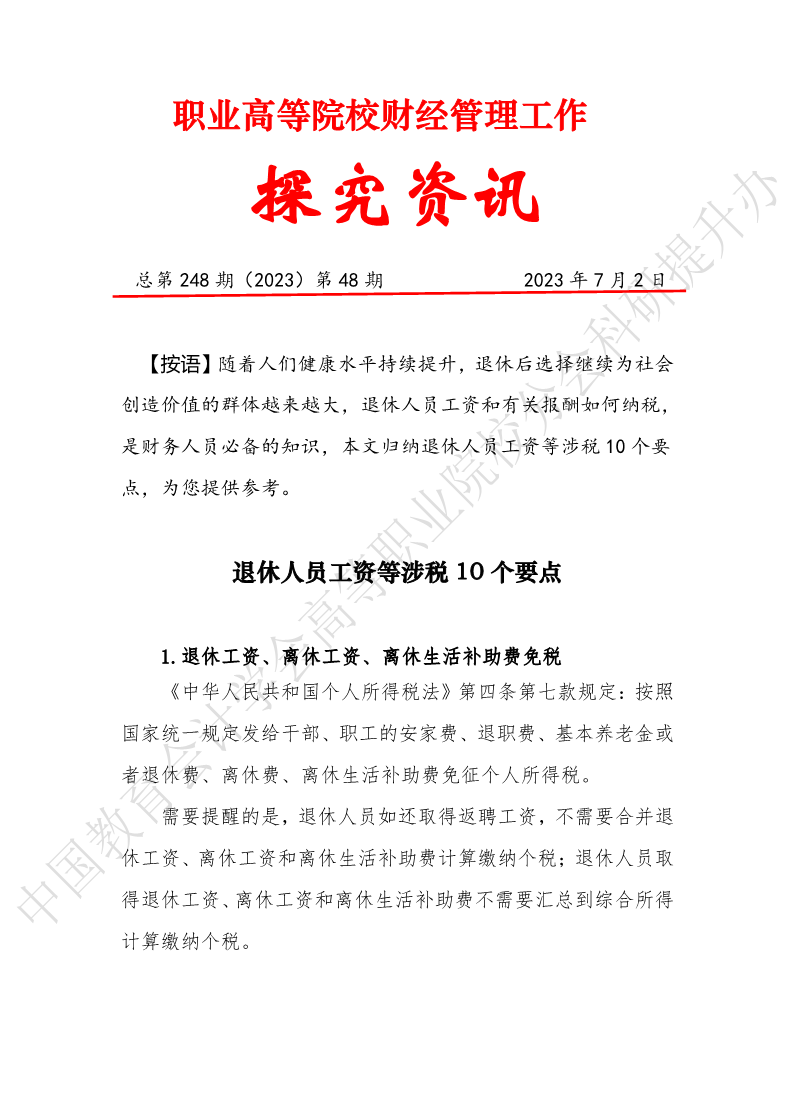 探究资讯248:退休人员工资等涉税10个要点