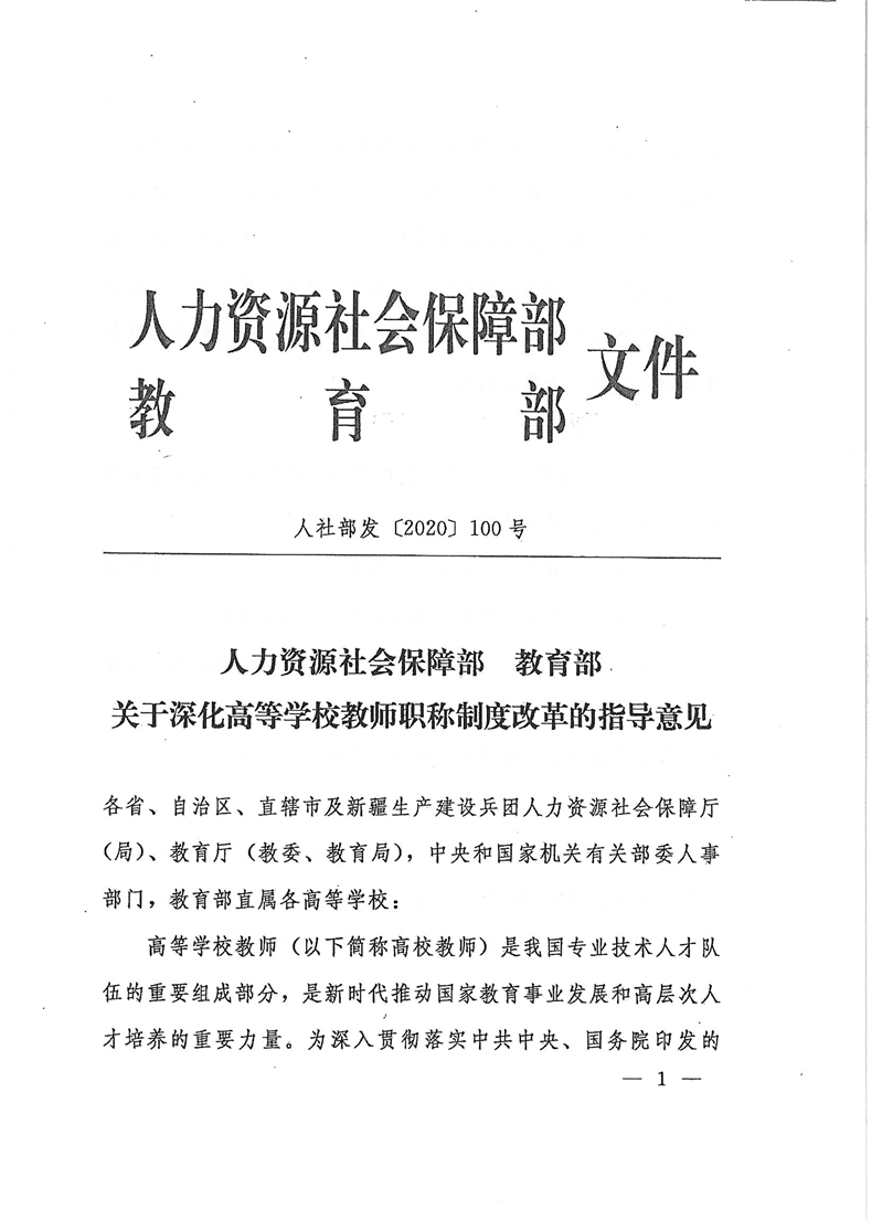 人力资源社会保障部 教育部关于深化高等学校教师职称制度改革的指导意见(人社部发〔2020〕100号) 来源: 发布时间:2021-11-22 11:31:27 浏览次数: 次 【字体:小 大】 终审:周明 分享到: 打印文章