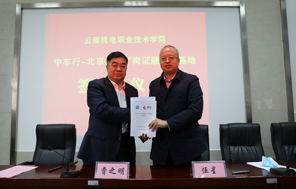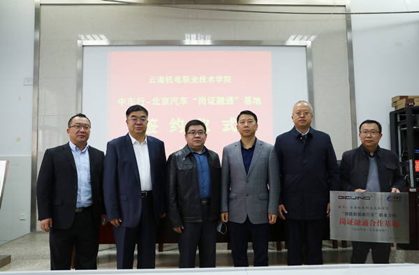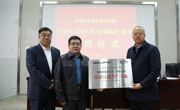 会上,学校与北京中车行高新技术有限公司签订“岗证融通”基地校企合作协议。北京中车行高新技术有限公司与北京汽车蓝谷营销服务有限公司为学校颁发中车行、北汽“智能新能源汽车”职业方向“岗证融通”合作基地牌匾。