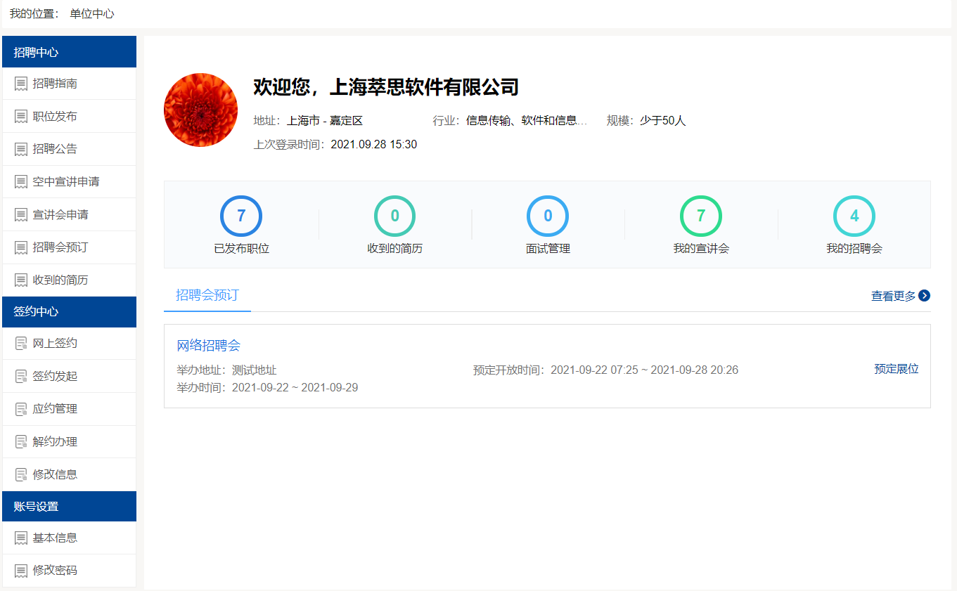 单位到我校申请空中宣讲会(招聘会),需要先到云南高校智慧就业平台进行注册,然后选择入驻我校,我校审核通过后,单位即可登录我校就业网,申请空中宣讲会。